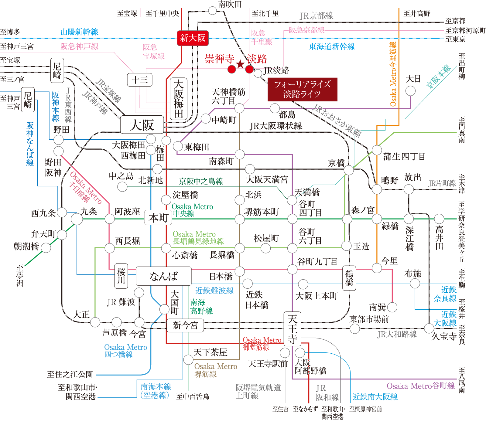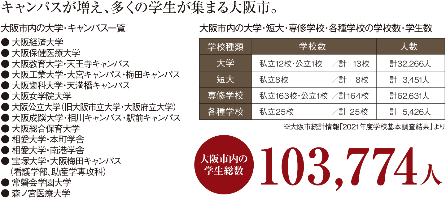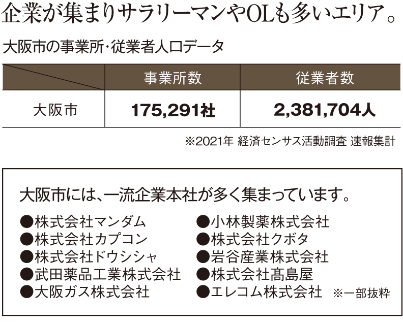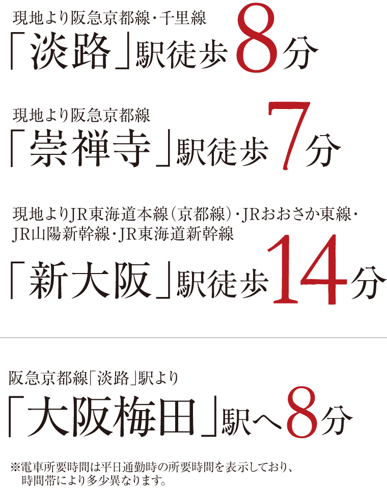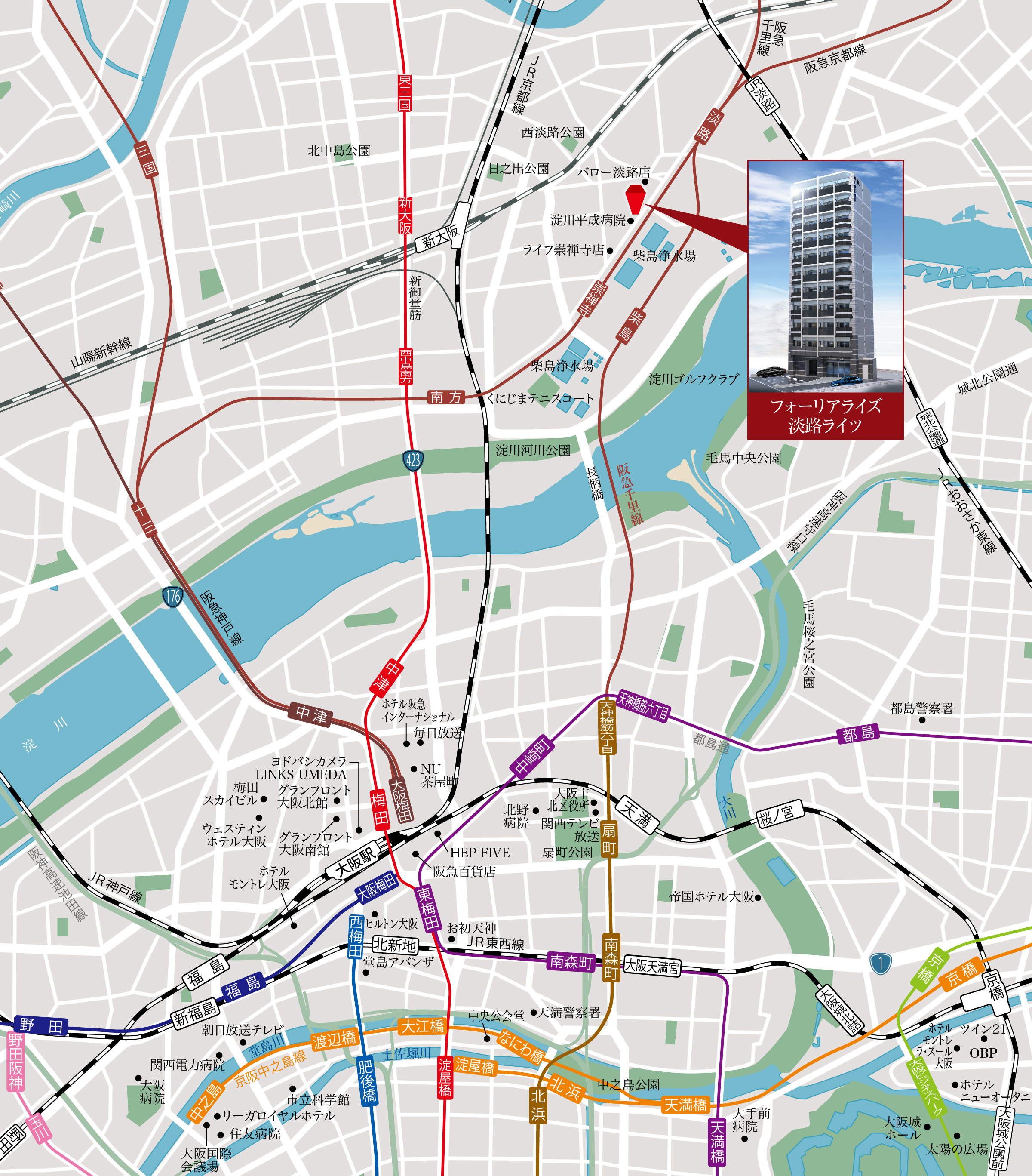 各鉄道路線が集うアクセスの拠点であり、あらゆる都市機能が集まる大阪の中心「大阪・梅田」エリアへ軽快アクセス。JR「大阪」駅(うめきたエリア)が開業したのをはじめ、うめきた2期地区が「グラングリーン大阪」として先行まちびらきされたほか、「イノゲート大阪」や中央郵便局跡地「KITTE大阪」の開業など、その進化の全てを享受できます。